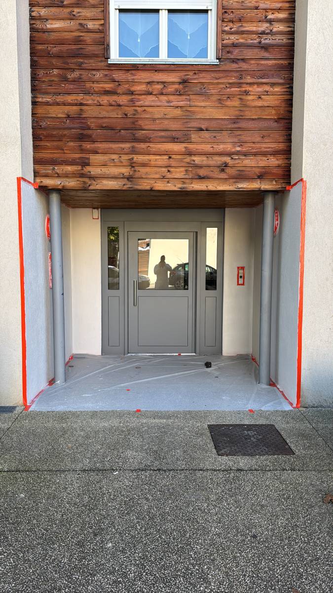 Les entrées et poutres en béton ont été entièrement révisées, avec une peinture spécifique hydrofaçade pour restaurer leur finition et assurer leur protection à long terme.